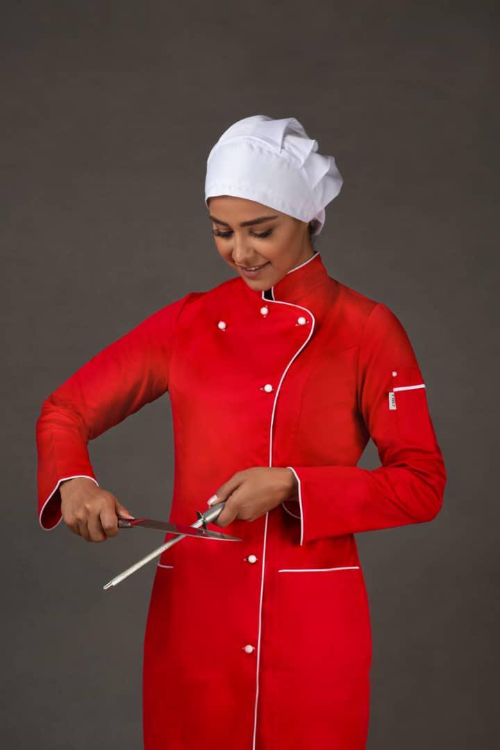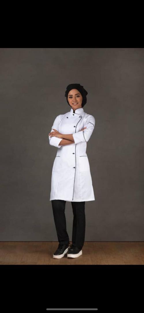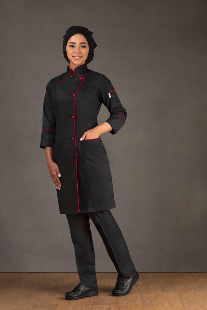 روپوش هان شف زنانه مورد استفاده برای خانم های آشپز و شیرینی پزهای خانم و … مورد استفاده میشود که این مدل داری ست پیشبند است که سمت راست سینه یک عدد حلقه طراحی شده که پیشبند از طریق بندچرم روی روپوش زنانه وصل میشود ، طریقه بسته شدن این مدل از طریق دکمهای پرسی میباشد